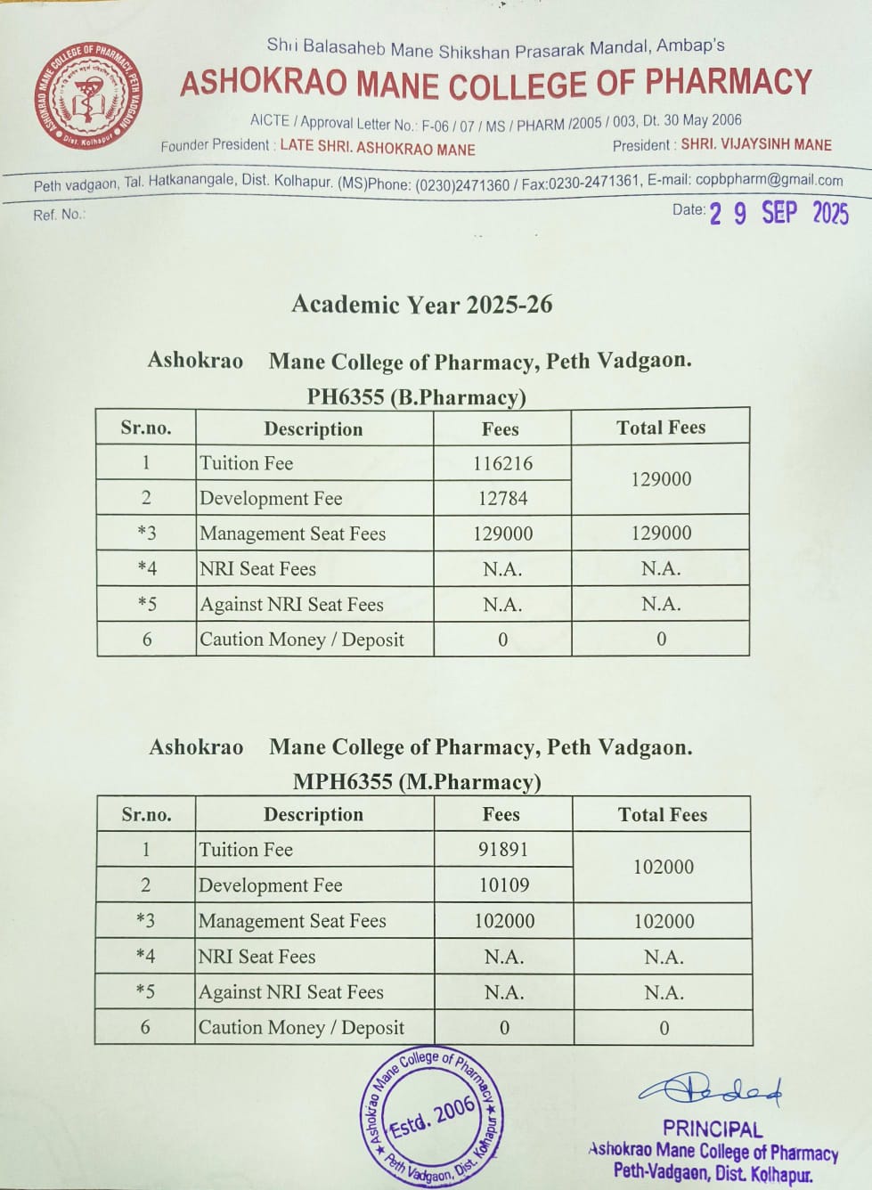 Note:- All Student hereby inform that your fees must be paid through D.D. ("Principal, Ashokrao Mane College of Pharmacy, Peth Vadgaon" payable at Peth Vadgaon.), or NEFT, RTGS.